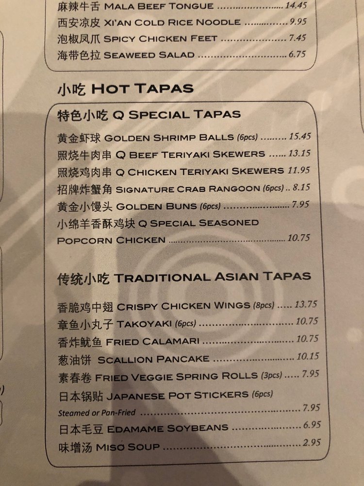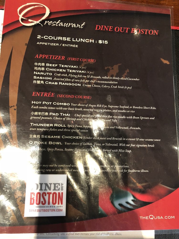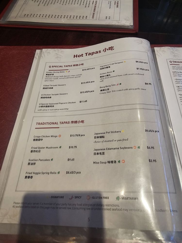 Introducing Q Restaurant, a trendy and modern dining spot in Boston offering a diverse menu with options for everyone. From cold appetizers like Avocado Salad and Naruto to hot tapas like Chili Fries and Q Beef Teriyaki Skewers, Q Restaurant delivers flavorful dishes with unique twists. The ambiance is upscale yet inviting, perfect for a casual dinner or a special celebration. Customers rave about the fresh sashimi sampler and the friendly service, making it a top choice for Asian cuisine lovers. With a wide range of vegan and vegetarian options, Q Restaurant caters to diverse dietary preferences without compromising on taste. Overall, Q Restaurant provides a memorable dining experience with a mix of Asian flavors and a welcoming atmosphere that will leave you wanting to come back for more.
